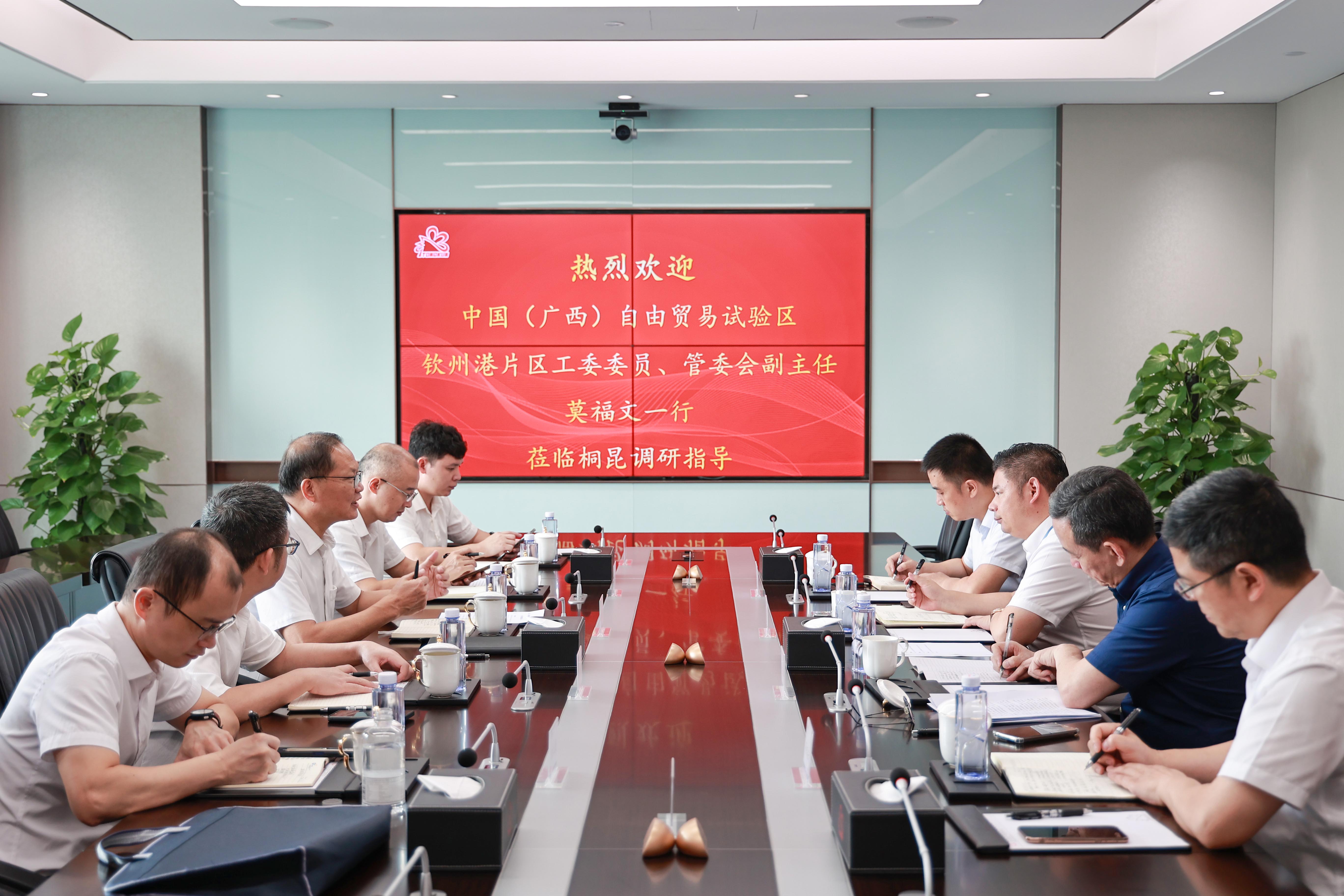 8月31日上午,中國(廣西)自由貿易試驗區欽州港片區管理委員會副主任、黨工委委員莫福文一行蒞臨桐昆調研,集團公司執行總裁李圣軍熱情接待并陪同座談。