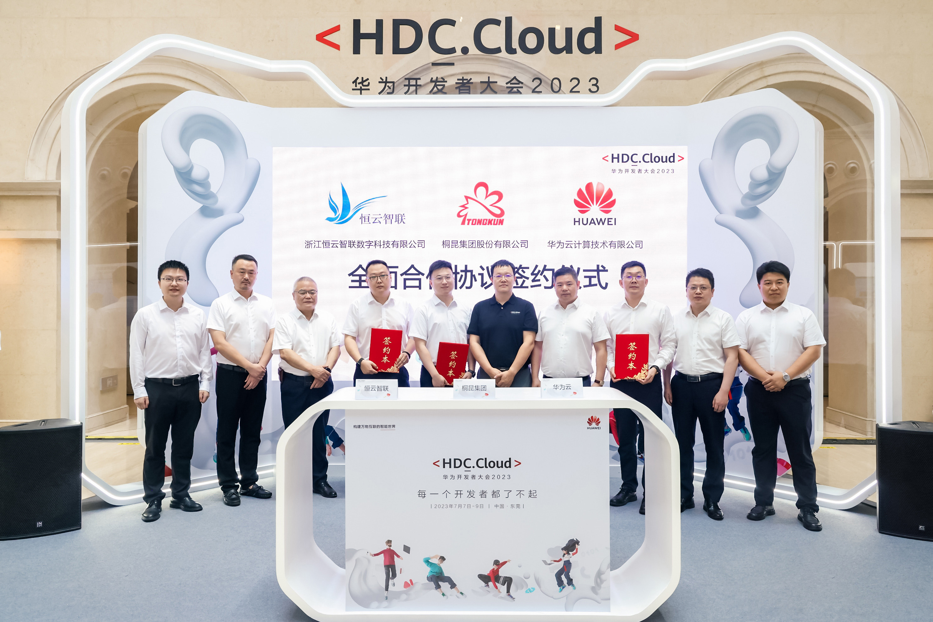 7月7日至7月9日,桐昆集團股份有限公司原董事周軍(現恒云智聯顧問),桐昆集團股份有限公司董事、執行總裁李圣軍,集團信息管理部、數字化推進部及恒云智聯相關負責人受邀參加華為開發者大會2023(Cloud),并與華為云全球生態部總裁康寧、華為云浙江總經理李鵬程、華為云浙江生態與運營部部長周俊共同出席桐昆集團股份有限公司、華為云計算技術有限公司、浙江恒云智聯數字科技有限公司全面合作協議簽約儀式。
