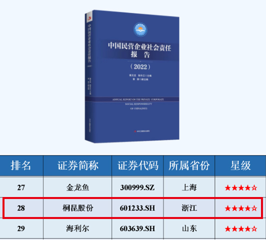 近日,全國(guó)工商聯(lián)發(fā)布了《中國(guó)民營(yíng)企業(yè)社會(huì)責(zé)任報(bào)告(2022)》和《中國(guó)民營(yíng)上市公司環(huán)境、社會(huì)及治理(ESG)專題報(bào)告》,并首次開(kāi)展了民營(yíng)上市公司ESG評(píng)價(jià)。這份首次發(fā)布的《ESG專題報(bào)告》通過(guò)構(gòu)建評(píng)價(jià)模型,根據(jù)調(diào)研數(shù)據(jù)和第三方信息,對(duì)2021年度全國(guó)參與調(diào)研的504家民營(yíng)上市公司進(jìn)行ESG評(píng)價(jià),形成民營(yíng)上市公司ESG指數(shù)。在ESG指數(shù)領(lǐng)先的50家企業(yè)榜單中,桐昆集團(tuán)股份有限公司位列28位。