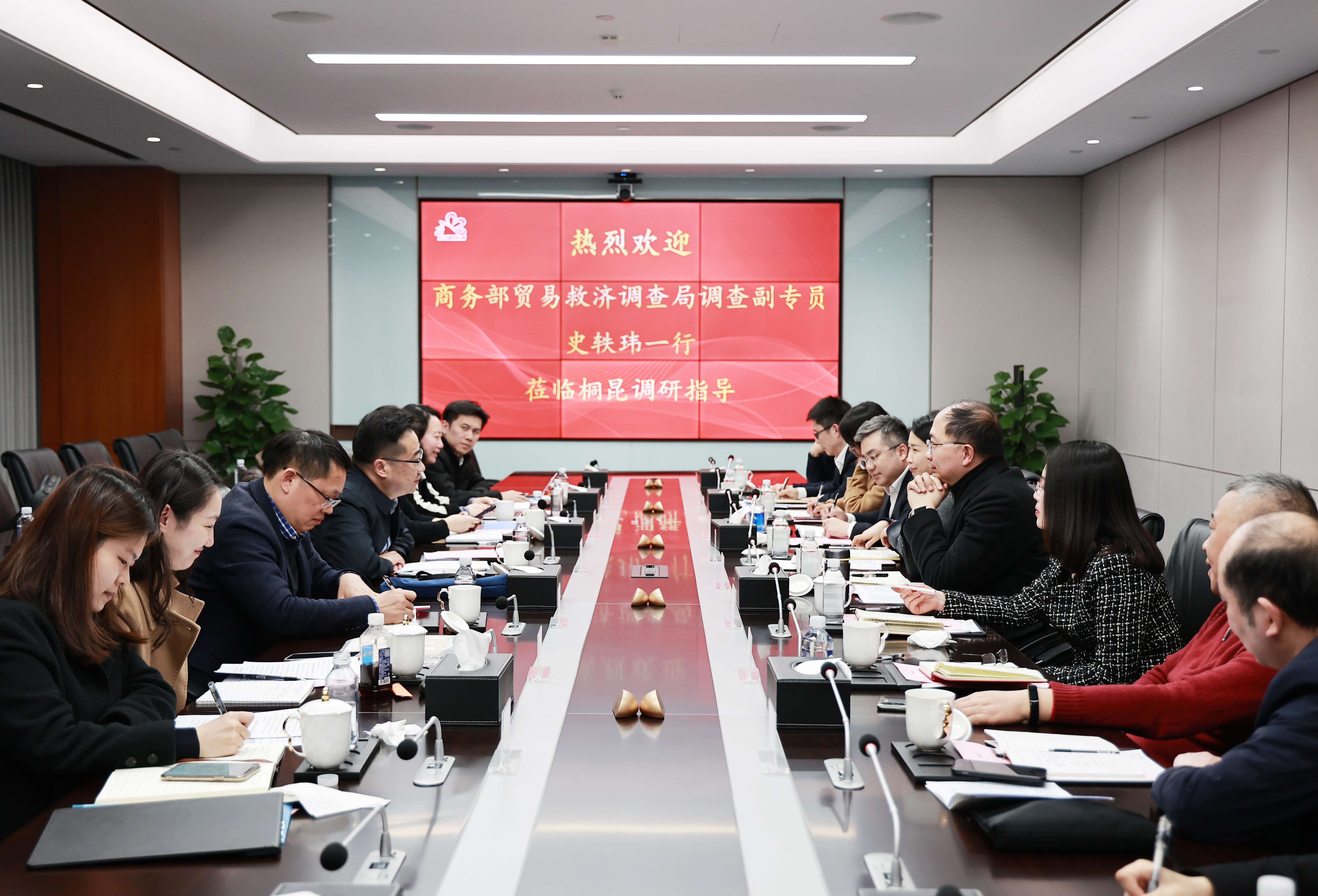 2月23日下午,商務部貿易救濟調查局調查副專員史軼瑋一行在浙江省商務廳貿易救濟調查局局長戴連俊、嘉興市貿促會會長潘國帥、桐鄉市商務局局長張小蕾等領導的陪同下蒞臨桐昆調研貿易摩擦案件應對工作,集團副董事長陳蕾、總裁助理徐奇鵬等熱情接待并陪同座談。